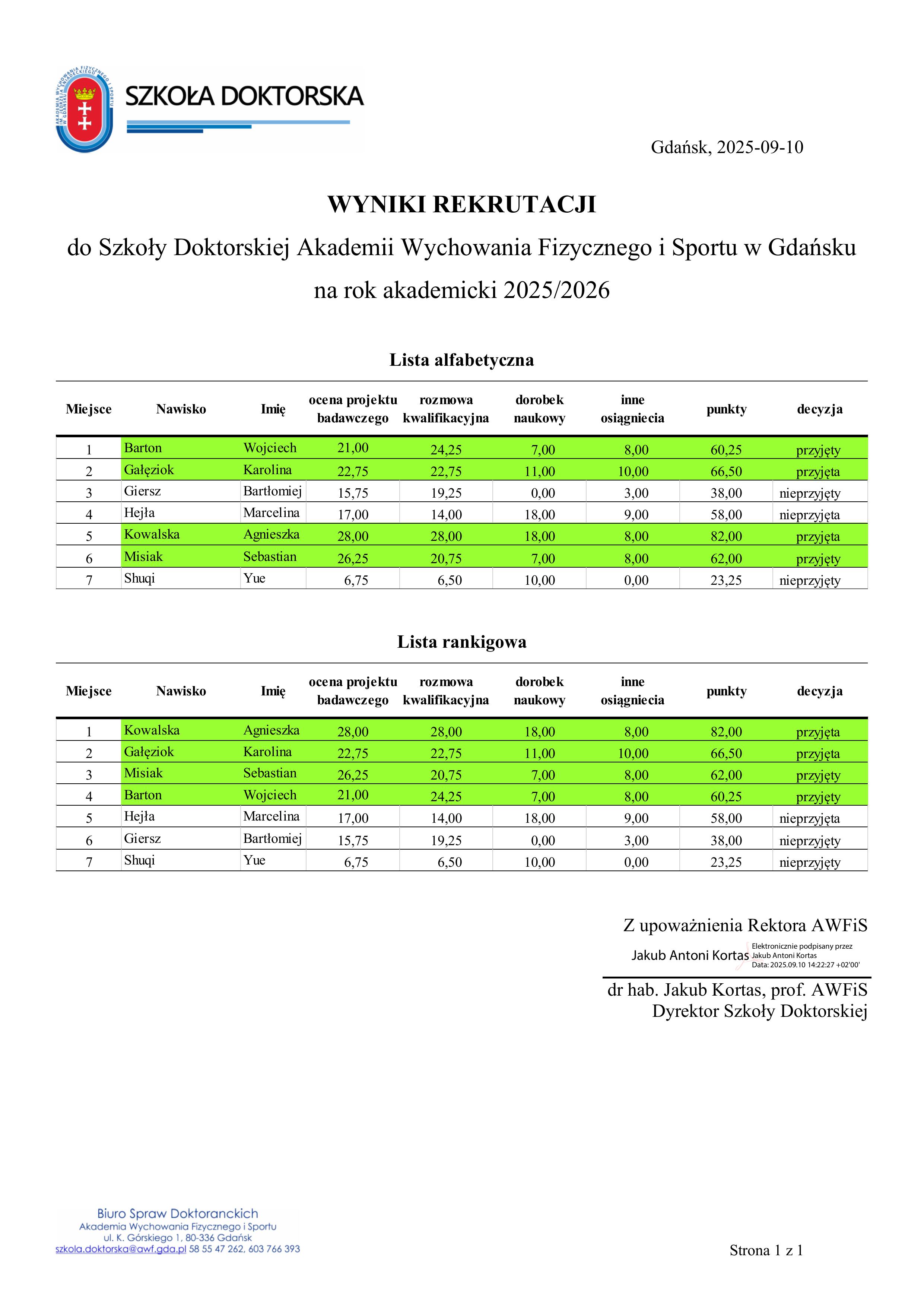 - Wyniki rekrutacji zostaną opublikowane w postaci listy rankingowej kandydatów do dnia 12 września 2025 r. na stronie internetowej AWFiS w zakładce https://awf.gda.pl/szkola-doktorska/rekrutacja/